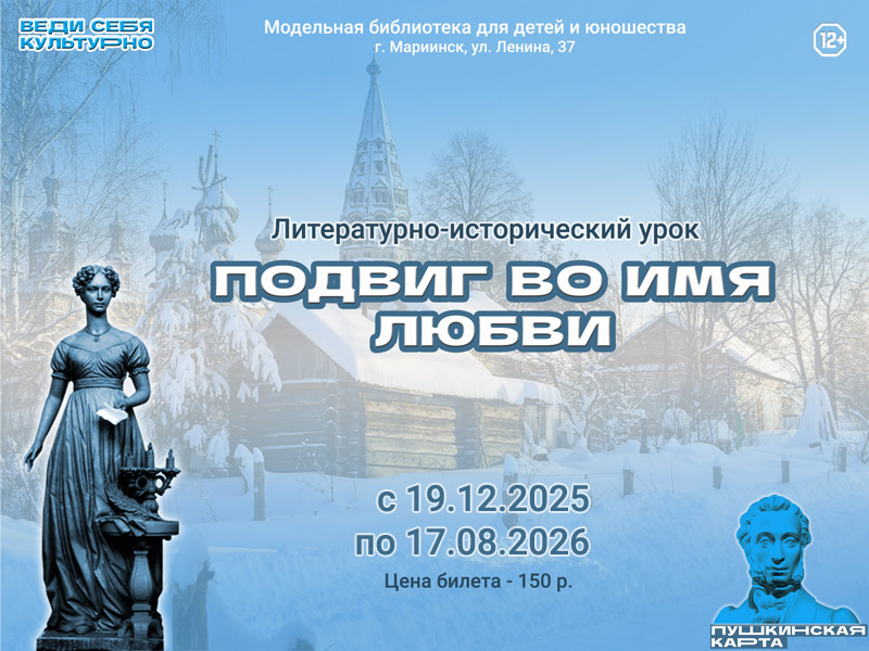 Встреча в библиотеке перенесет ее участников в эпоху XIX века. Для молодых людей приоткроется одна из страниц российской истории, начавшаяся в Петербурге, на Сенатской площади. Это будет рассказ о любви, вере, терпении и преодолении, где с помощью мультимедийного оборудования можно будет проследить всю историю жизни сосланных в Сибирь декабристов и их семей.
