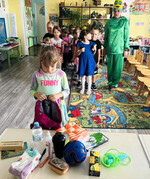 В начале мероприятия Незнайка прочитал детям историю о забавной лягушке-путешественнице, покорившей сердца всех детей своей отвагой и любопытством. После прочтения к ребятам неожиданно прилетела сама героиня сказки - веселая и смелая Лягушка. Она рассказала дошкольникам о невероятных приключениях, которые её ждали в небе среди стаи уток.